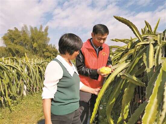 ■丰圣(右)走访三甲镇罗村村火龙果特色产业基地,了解农户种植情况。