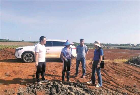 ■薛刚(左一)在陈思英(左二)的田间实地勘察,引导现代科技示范园对其进行帮扶。