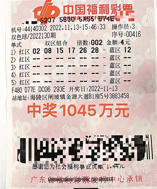 新快报讯 记者陆妍思 通讯员谭木娇报道 11月13日,双色球第22130期开奖中,阳江市海陵区闸坡镇金源大道B1座5号的44140302福彩投注站喜中2注522万多元头奖,中奖彩票是一张4元2倍1注单式票,单票总奖金1045万多元。中奖次日,幸运儿李伯(化名)即火速现身福彩中心兑奖处办理了领奖手续。