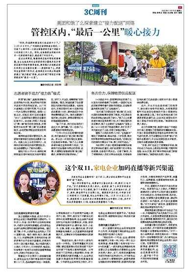 “接入即时零售平台,消费者可以像点外卖一样,购买3C电子产品。”苏宁易购相关负责人表示。在美团、饿了么和京东到家这些即时零售平台可以看到,除了个体商家之外,还有诸如小米、苏宁、美的、康佳等平台与品牌入驻。据美团外卖介绍,今年参与双11的数码3C门店数量,同比去年增长2倍。10月30日至11月1号,美团数码3C品类外卖订单销售额同比去年增长13倍,其中手机品类销量增长13倍、电脑品类销量增长73倍。
