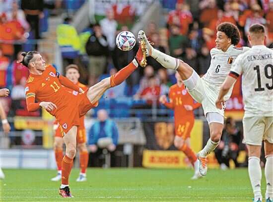 ■2022年6月,比利时队球员维特塞尔(右)与威尔士队球员贝尔在欧国联比赛中拼抢。新华社发
