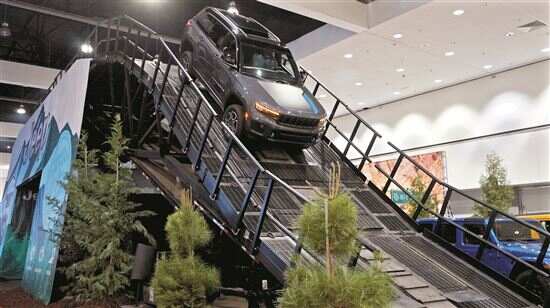 ■参观者在洛杉矶车展媒体预展上试驾一款越野汽车。