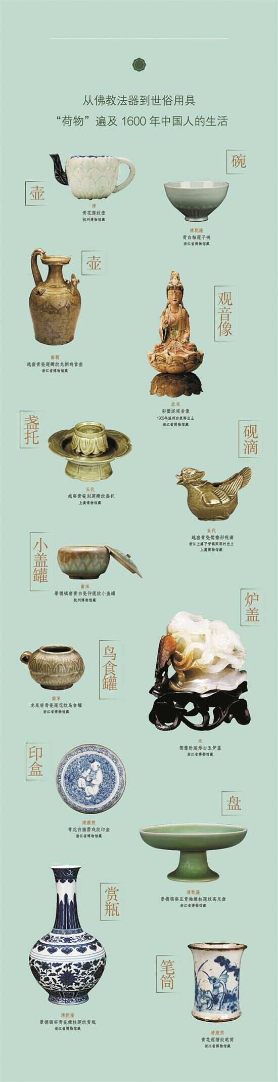 那么,让我们打开这本书——《荷物志:博物馆里的千年荷韵》。它由浙江省博物馆编写团队,耗时三年打造,是第一本全方位讲述“荷”在1600年中国历史、文物中“美与用”的书。六家官方文博机构收藏的百余件中国荷主题文物,以及更多的扩展资料,以图像志形式,唤醒着每位读者,心中那一亩悠扬的荷塘: