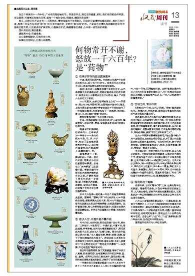 《荷物志》中介绍,自元入明清,“荷物”越来越世俗化。“荷塘风光、河池水禽、婴戏莲花等富有民间生活气息的图案大量出现”。