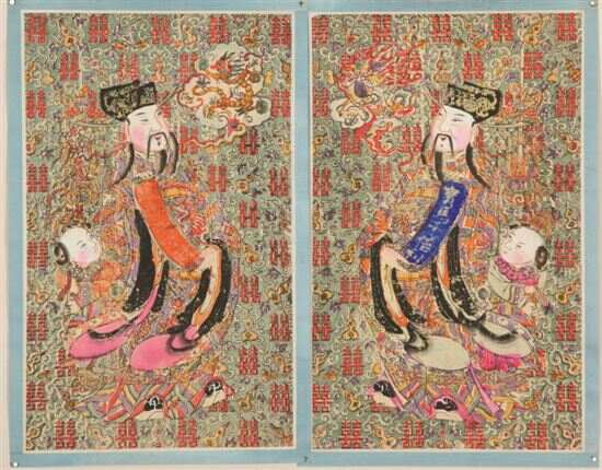 ■绿地囍字天官赐福门神 55.5x34cm 清代