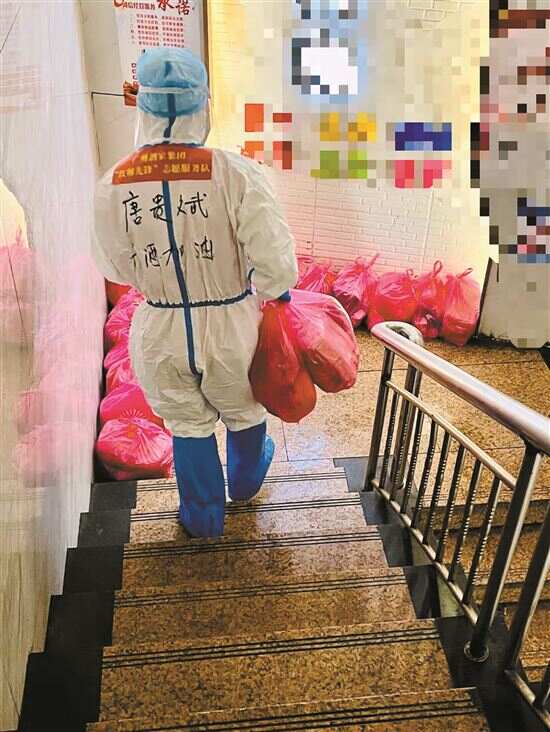 城中村人口密集,每一条巷子有三十多栋楼,每一栋租户众多,能送一户就多一份安心。我今年四十岁,不惑之年,平常喜欢跑步锻炼身体,穿着防护服走上几个小时不成问题。这几天帮助居民完成物资配送上门的服务,微信步数都在22000步以上。11月11日,按照组织部和指挥部统一安排,我又调到江海街道大塘社区继续进行支援。我相信,我们一定能坚守到胜利的到来。