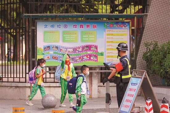 早上7时50分许,新快报记者在祈福新邨小区内的各小学看到,家长们陆续将孩子送到校门口,目送着“自家娃”在校门口亮码测温后步入校园。孩子们见到久违的老师和同学,远远地挥手打招呼。“能把孩子送回学校上课,很开心。虽然目前的情况,自己多少还是有点儿担心,但开学前,看到老师们尽职尽责地要求每一位学生和家长都做好健康监测和核酸检测,来保障孩子返校安全,我感到安心了不少。” 校门前,一位家长向记者分享了自己的心情。据了解,学生进入校园后,除了需要亮码、测温外,还要洗手、上交7天自我健康监测表格和24小时核酸阴性证明等。