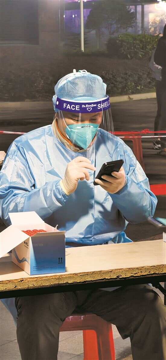 脱下防护服回到酒店,工作之余的徐爽经常给妻子打电话,向防疫工作经验更丰富的妻子请教。“每当更换采样管时,竖着扫样管码,这样扫码报错的几率低。”“在身边多放一个凳子,有些老人家行动不方便,可以坐下慢慢来,这样也不影响后面人检测的进度。”“你说的这些我都有留意,真的很受用。”在为期一周的支援工作中,徐爽和突击队同事一起,帮助社区做好防疫工作。核酸检测工作志愿者人手不足时,他和同事主动“加班加点”,保证核酸检测工作正常开展。