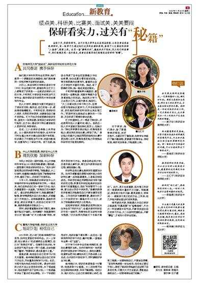 对于保研,她们表示,除了要提前做好规划、定好目标外,也要及时了解咨询,如向学长学姐们了解大概流程,更要善于收集专业、学校信息,做好充足准备,方能提前上岸。