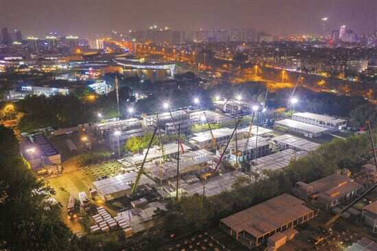 ■11月22日,近2000名建设者正以最快的速度推进广州天河区方舱医院建设,争取今日完成所有项目建设,24日交付使用。新快报记者 李小萌 郭思杰/摄