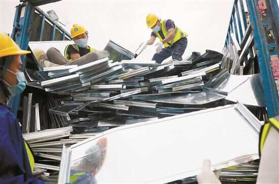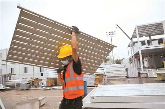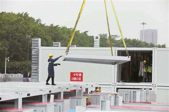 ■天河区方舱医院,工人正在搬运高低床的床板。