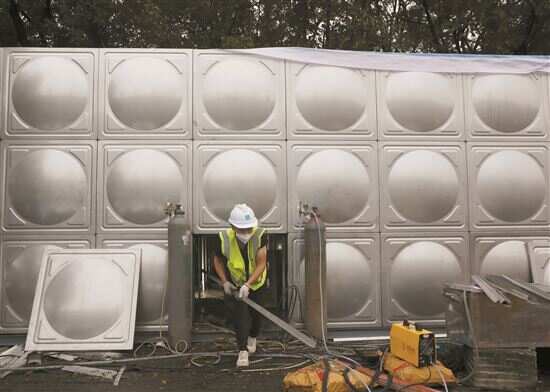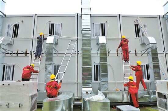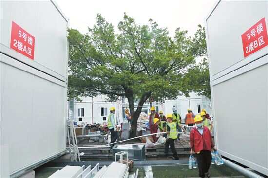 ■天河区方舱医院,工人们正在安装淋浴间房顶。
