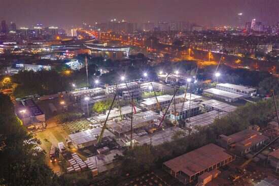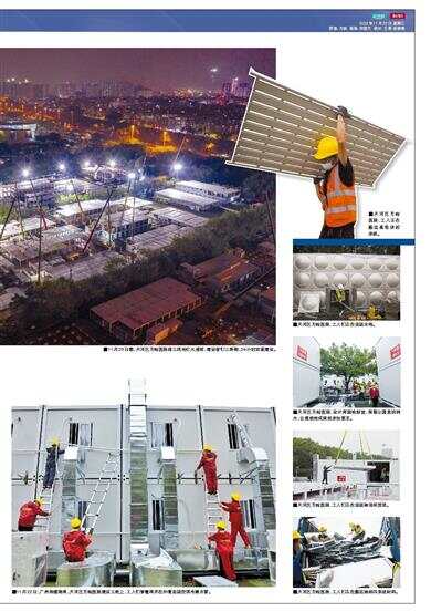 ■11月20日晚,天河区方舱医院施工现场灯火通明,建设者们三班倒,24小时加紧建设。