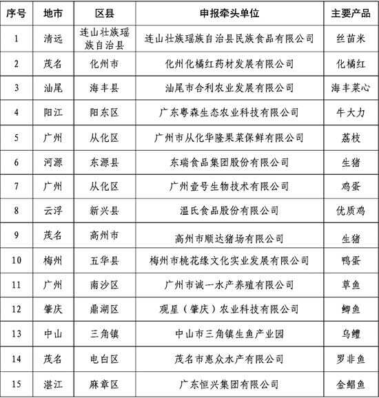 新快报讯 记者高镛舒报道 11月23日,广东省农业农村厅、广东省市场监督管理局官网发布《关于公布广东省第一批现代农业全产业链标准化示范基地名单的通知》(下称《通知》),公布了首批15个“省级现代农业全产业链标准化示范基地”。