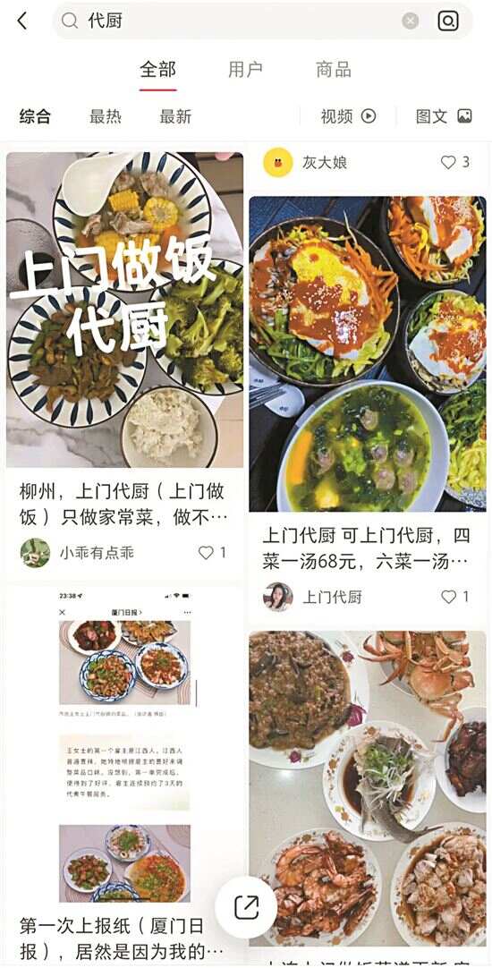 其实,上门代厨这项新型消费、新兴服务已在广州悄然生根发芽。记者在小红书、抖音等平台搜索发现,有不少精通厨艺的年轻人把代厨当成兼职或全职工作,通过社交平台招揽生意。