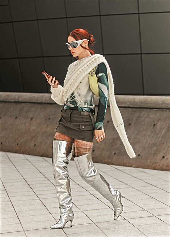 ▶金属色过膝靴带有强烈“未来感”,用来演绎当下流行的复古未来风很可。