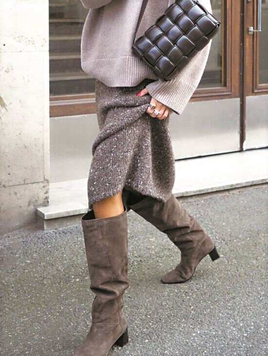 ▲自带暖感的麂皮和柔软舒适的针织似天作之合,靴筒可“宽松”些更显慵懒氛围感。