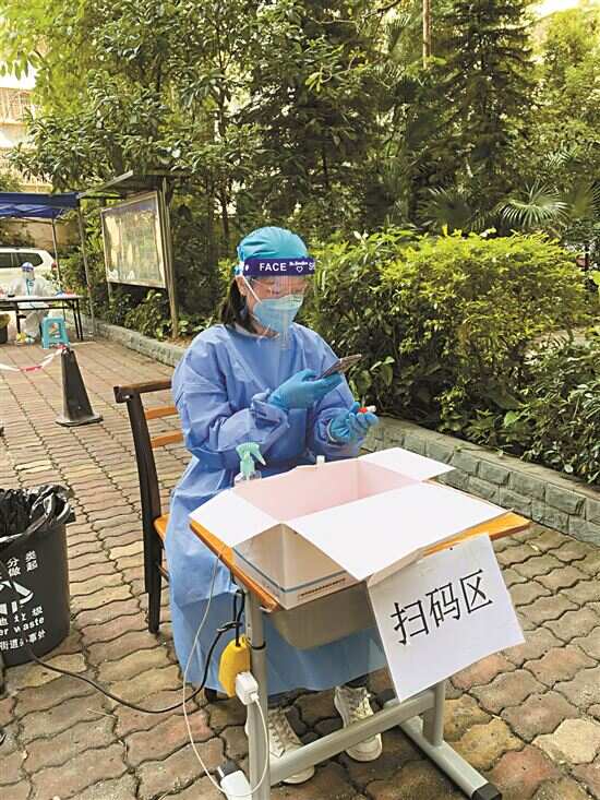 吴莉主要负责扫描核酸码,她还记得23日那天,自己扫了至少500管。“不要看扫码好像很简单,但一只手长期举着手机,一直低头往下看,时间久了两眼冒金星,肩膀和颈椎都很累,一上午下来头很晕。”虽然辛苦,但吴莉知道这份辛苦很有意义,“我女儿6岁,她奶奶带她下楼做核酸时,她认出了我和她爸爸,很自豪地指着我们俩对她的小伙伴说,‘这个是我妈妈,那个是我爸爸,他们今天做大白了!’”吴莉觉得,他们做志愿者不仅能服务他人,还能对孩子言传身教。