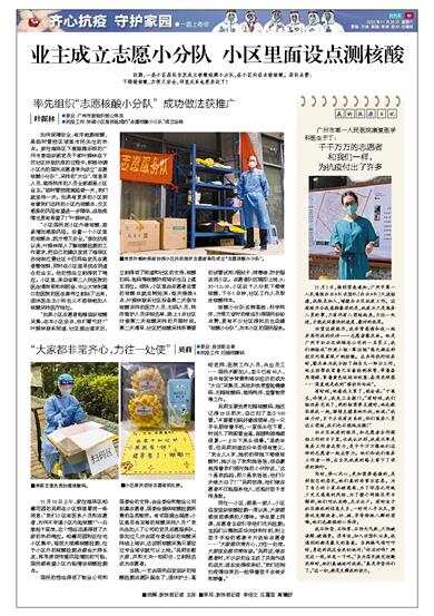 如何保障安全、有序地测核酸,是临时管控区域里市民关注的热点。家住海珠区下渡路雅乐街的广州市委组织部党员干部叶振林在下沉社区协助抗疫的过程中,积极协调小区内的居民志愿者率先成立“志愿核酸小分队”,采样的“大白”、信息录入员、维持秩序的人员全部都是小区业主。“临时管控措施延续一天,我们就坚持一天。如果有更多的小区拥有像我们这样的小区内核酸点,交叉感染的风险有望进一步降低,战胜疫情也更有希望了!”叶振林说。
