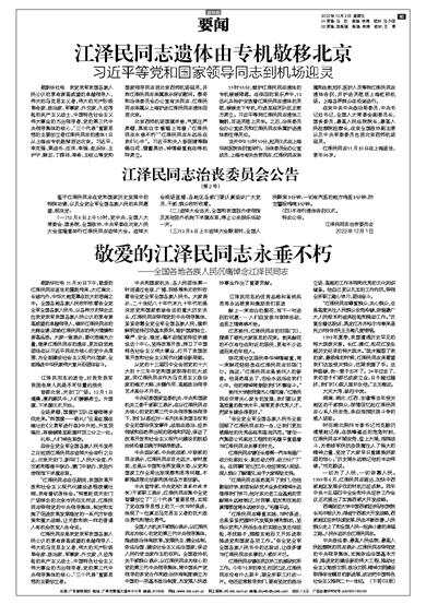 自告全党全军全国各族人民书发布之日起到江泽民同志追悼大会举行之日止,北京天安门、新华门、人民大会堂、外交部和香港中联办、澳门中联办、我驻外使领馆下半旗志哀。