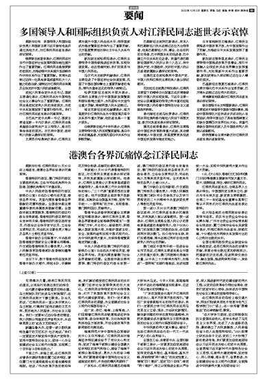 1日,《大公报》、香港《文汇报》和《澳门日报》等港澳主要媒体刊发大量文字、图片、视频报道,悼念、缅怀江泽民同志。