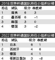 两届世界杯小组赛加起来,德国队战绩为2胜1平3负,只拿到了7个积分,累计打入8球丢掉9球。