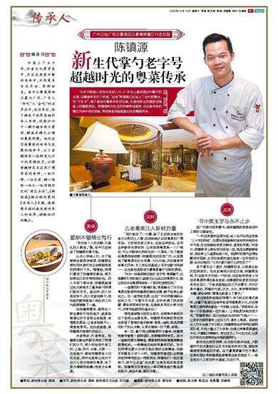 通过阅读和追随老师傅们,学习纯正的粤式美味,在餐厅里通过佳肴向食客传播粤菜文化,亦在将粤菜之魂传承给新生一代的路上奋进。“我很幸运,在每一个阶段都有一位引路人,让我能更快地找到方向。”陈镇源表示,自己也想成为这样的“引路人”——让更多的厨师喜欢上这份工作、喜欢上粤菜。因此他在工作中也做了不少努力,陈镇源现在所带领的厨师团队里,年轻力量占了大多数,他通过将粤菜菜谱电子化、汁酱配方精确化、烹饪技艺公开化的方式,以更加开放的态度展现给年轻的厨师们。