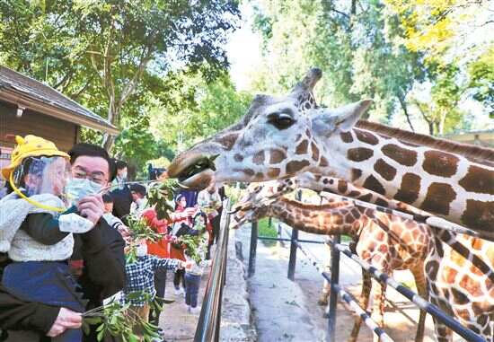 ■12月10日,广州动物园,家长带着小朋友们给长颈鹿喂树叶。当日,广州动物园进园人数接近8000人。新快报记者 李小萌/摄