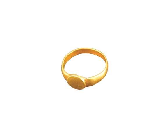 ◀戒指,西汉,环径1.85-1.95厘米,重4.9克,2001年出土于广州市越秀区恒福路银行疗养院一期工地M21,现藏于南汉二陵博物馆。金制,用扁金条弯曲成近圆形环体,戒面呈扁椭圆形。光素无纹。李岩供图