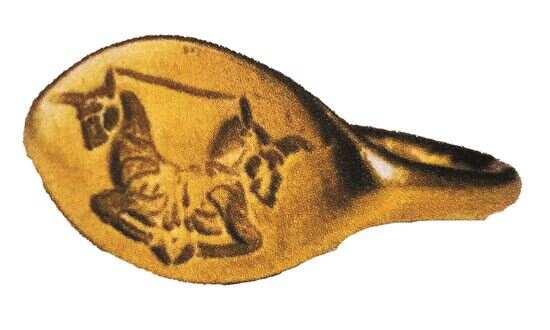 ▶大英博物馆收藏的阿姆河珍宝中的一枚金戒指上,亦有背靠背动物形象,显示此类造型在巴克特里亚地区运用甚早,在欧亚草原也十分流行。阿富汗,蒂拉丘地出土,公元前1世纪到公元1世纪。(《器服物佩好无疆:东西文明交汇的阿富汗国家宝藏(增订典藏版)》)