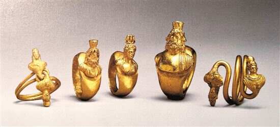 ▲戒指一组,公元前1世纪-公元1世纪,塞拉皮斯和伊西斯胸像造型,古埃及。(史永、贺贝《珠宝简史》,商务印书馆)