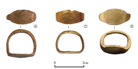 “10件戒指没有接缝痕迹,4件见接缝,一些样品表面有粗糙铸造痕迹。“这种未经处理的表面和边缘,暗示它们并不是现实中佩戴的,而是用作随葬的。如果这个推测正确的话,那么就可以认为,当地手工作坊是按需制造产品。”