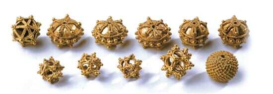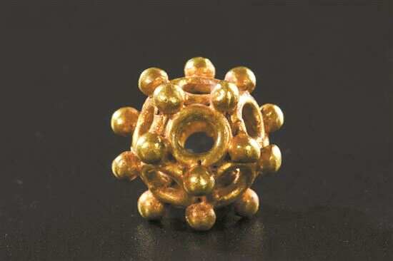 用焊珠工艺制作多面体金珠,则可能发源于迈锡尼时代(公元前1600-公元前1100年)的希腊。多面金珠最普遍的为十二面体,是意大利伊特鲁利亚人于公元前500年左右首先制造出来,也有少量二十面体的,可能与地中海沿岸古典文明的天文学、哲学、数学等学科发展存在密切关系。