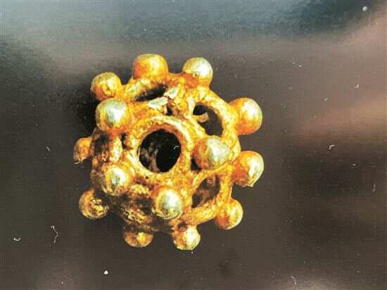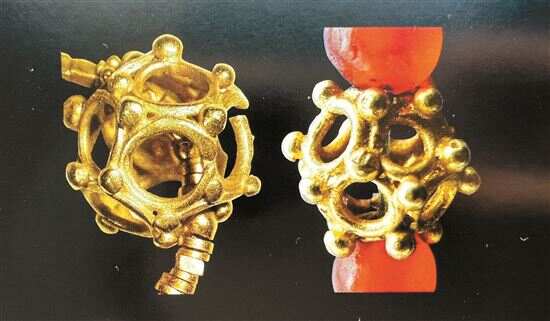 恒福路银行疗养院西汉中期墓出土一颗,2000BHM21:65,在每三个圆环交接处焊接一颗金珠。这是我国目前发现年代最早的多面金珠。