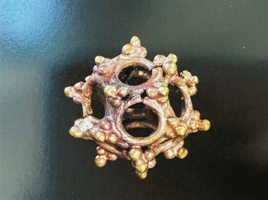 1980年江苏邗江县甘泉镇东汉前期广陵王刘荆墓出1件,为十四面体,用两个较大的和十二个较小的金圈拼焊成24个角的空心球,然后在金圈相接的24个空当处,再各用四颗细如菜籽的小金珠堆焊出24个尖角。