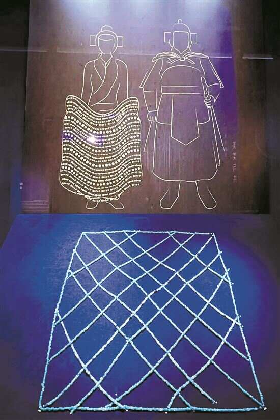 ■M151珠饰使用想象复原。西汉,2010年荔湾区西湾路旧广州铸管厂M151出土。“珠褥”想象复原展示。2022年5月26日-10月9日,“只此绚丽——广州出土汉代珠饰展”在南汉二陵博物馆举行。