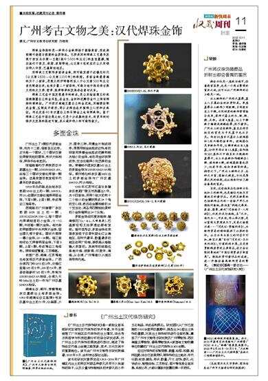西湾路旧广州铸管厂东汉前期M35出土的一颗,2010GXZM35:106-2,每个圆环内焊满细密的小金珠,11~12颗,中间堆一颗大金珠。有对称的两面圆环中央未焊大金珠,留出圆孔便于穿系。圆环外围焊一圈小金珠,23~24颗。每三面相邻处又焊接两层金珠,下层3颗,上层1颗,形成等边三角塔形。焊珠细密繁复,工艺精湛。