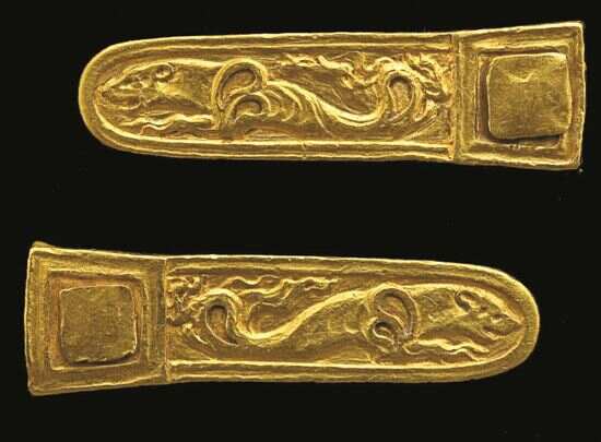 同时,这些黄金宝藏中,也具有很多来自中国的图像元素。如4号墓出土当用于栓系短剑的一对带扣,扣身均饰有豹纹,豹首和前爪清晰可见,腹部以下不见,变化成了抽象的卷曲纹饰——这与西汉漆器、铜镜等器物上常见的纹饰如出一辙,即动物的上半身清晰可见,而下半身均幻化为翻卷的云气纹。