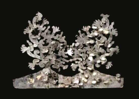 王冠每个组件上面,有规律地缀满了圆形薄金片和6叶形花饰。5个片状的花形树,中央的那片较宽,造型上呈现出一种对称的拱极形,尖部是心形,两侧如同两条头向下龙的剪影,底部中央的圆形内,是一个反旋的涡纹(这是一种常见的中国纹饰)。两侧的4片较窄,整体呈对称的宝瓶形造型,尖部是心形,两侧分别是一只鸟相向站在翻卷的纹饰上,最下面是龙尾的形状,中央是镂空的两个相背的心形中间夹着一个新月形。