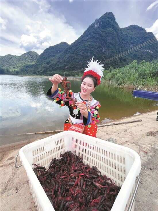 ■清新区浸潭镇乡村振兴示范带白花塱村大塘美丽宜居村,瑶族小姐姐在宣传稻虾共作基地的小龙虾。