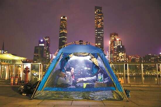 ■市民在广州塔二楼平台上露营,欣赏珠江美景。
