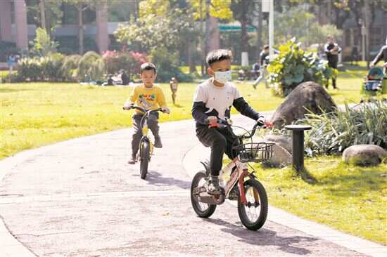 ■在二沙岛体育公园里,小朋友在骑自行车。