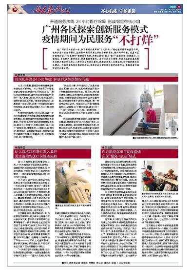 在广州各区的抗疫一线,除了涌现众多秉持“与人民同心”理念做好服务的基层干部,也探索出不少服务模式,让受影响的居民更主动配合防疫要求,做到科学防控。在荔湾区岭南街开设了“岭里相伴”健康服务热线,为群众提供“线上+线下”政策咨询、情绪疏导、心理减压、自我防护、物资保送、紧急就医等服务。在白云区白云湖街,街道羊城家政基层服务站配对就近的低收入人群为求助的居民服务,既解决困难人员就业率,同时高效解决居民需求。为做好高风险区患者的救治,海珠区成立高风险区医疗保障平台,根据患者的病情进行分级诊疗。