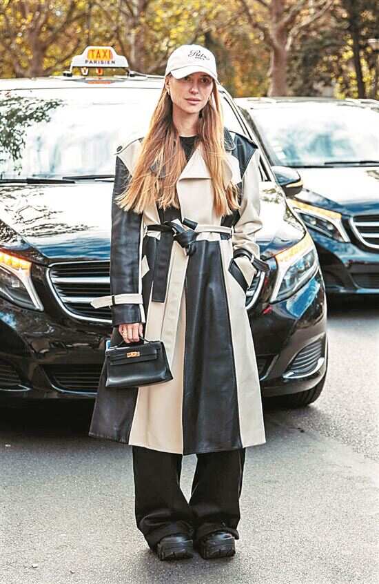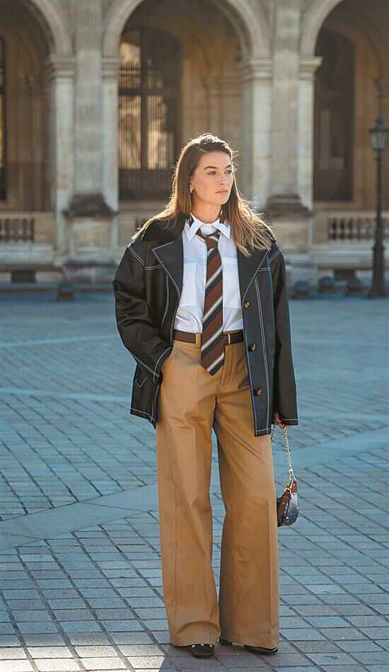 ▲饱和度较低的颜色与经典皮革色的拼接让造型装扮的“攻击性”减弱,可内搭更多风格的服饰。
