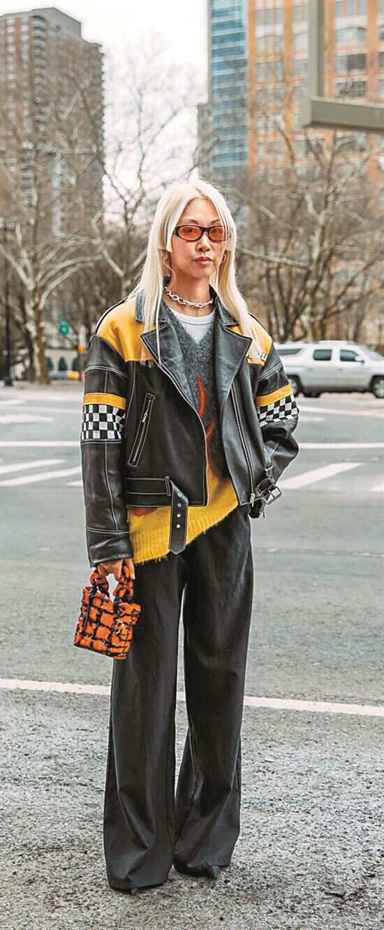 拼色皮衣是今季造型的绝佳选择,黑、白、棕的经典皮革色之间拼接,原本低调的色彩瞬间抢眼;经典皮革色与红、黄、绿等亮色之间的拼接,没有纯亮色皮衣那么挑人,但又兼具足够戏剧感。