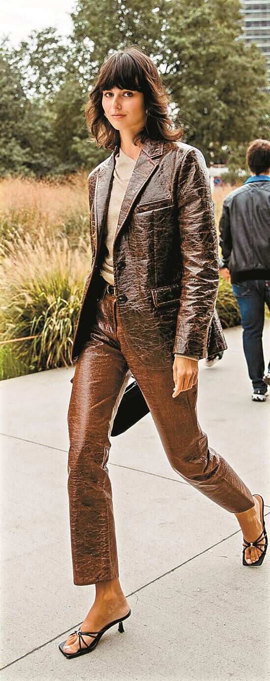 今年更流行日常实用的黑色哑光皮面,或充满肌理感的纹理皮面,光泽越低调自然越实穿,即使是全身皮质套装也不会过于夸张。