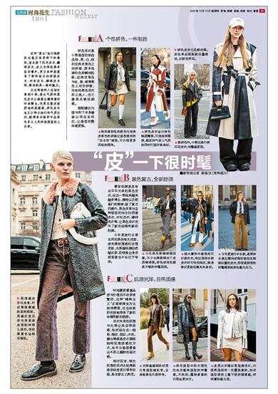 ▶肌理感皮衣与皮草、针织等温暖感的面料搭配,质感反差没有与亮面漆皮搭配时那么强烈,驾驭难度也会相应降低。