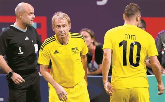 ■12月15日,前德国国脚克林斯曼(中)在比赛中替换前意大利国脚托蒂(右)登场。新华社发