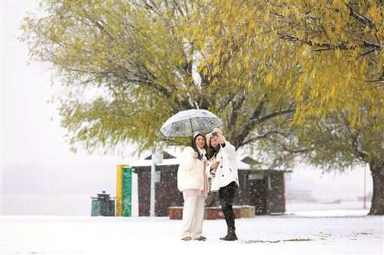 受寒潮影响,江苏多地迎来降温和雨雪天气。16日,在江苏省淮安市,游人在洪泽湖古堰景区欣赏雪景。(新华社)