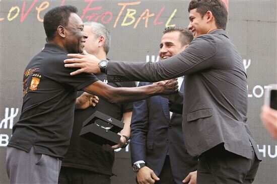 7年前,贝利还曾造访当时广州恒大的训练场——里水训练基地。当时,贝利和恒大主帅卡纳瓦罗、球员埃尔克森(艾克森)、钢琴家郎朗一同出席一个活动。在现场,卡纳瓦罗、埃尔克森都变成了追星族。